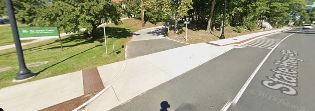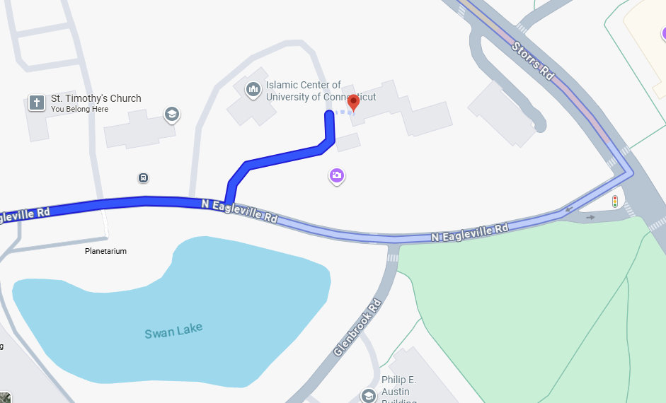 If you’re coming from Storrs Road, turn into North Eagleville and then find the driveway that goes between the Congregational Church and the Islamic Center. It is across the street from a little pond (“Swan Lake”) and looks like this: